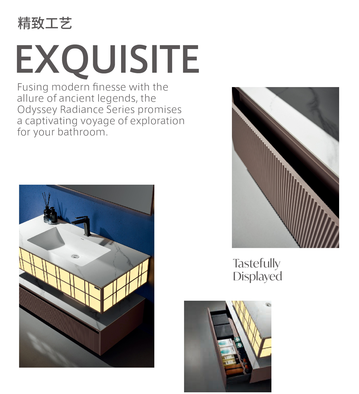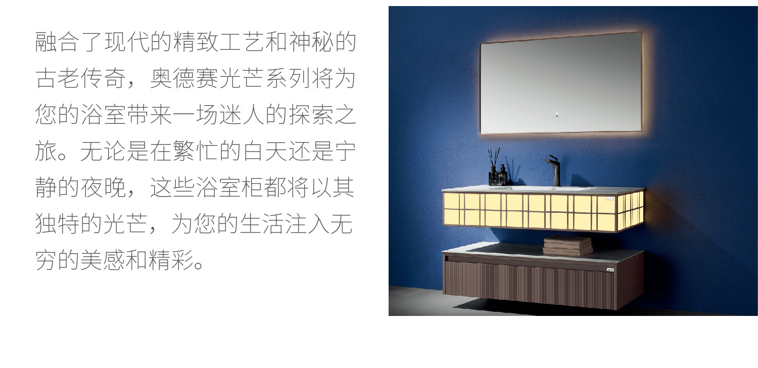 融合了現代的精致工藝和神秘的古老傳奇,奧德賽光芒系列將為您的浴室 帶來一場迷人的探索之旅。無論是在繁忙的白天還是寧靜的夜晚,這些浴 室柜都將以其獨特的光芒,為您的生活注入無窮的美感和精彩。