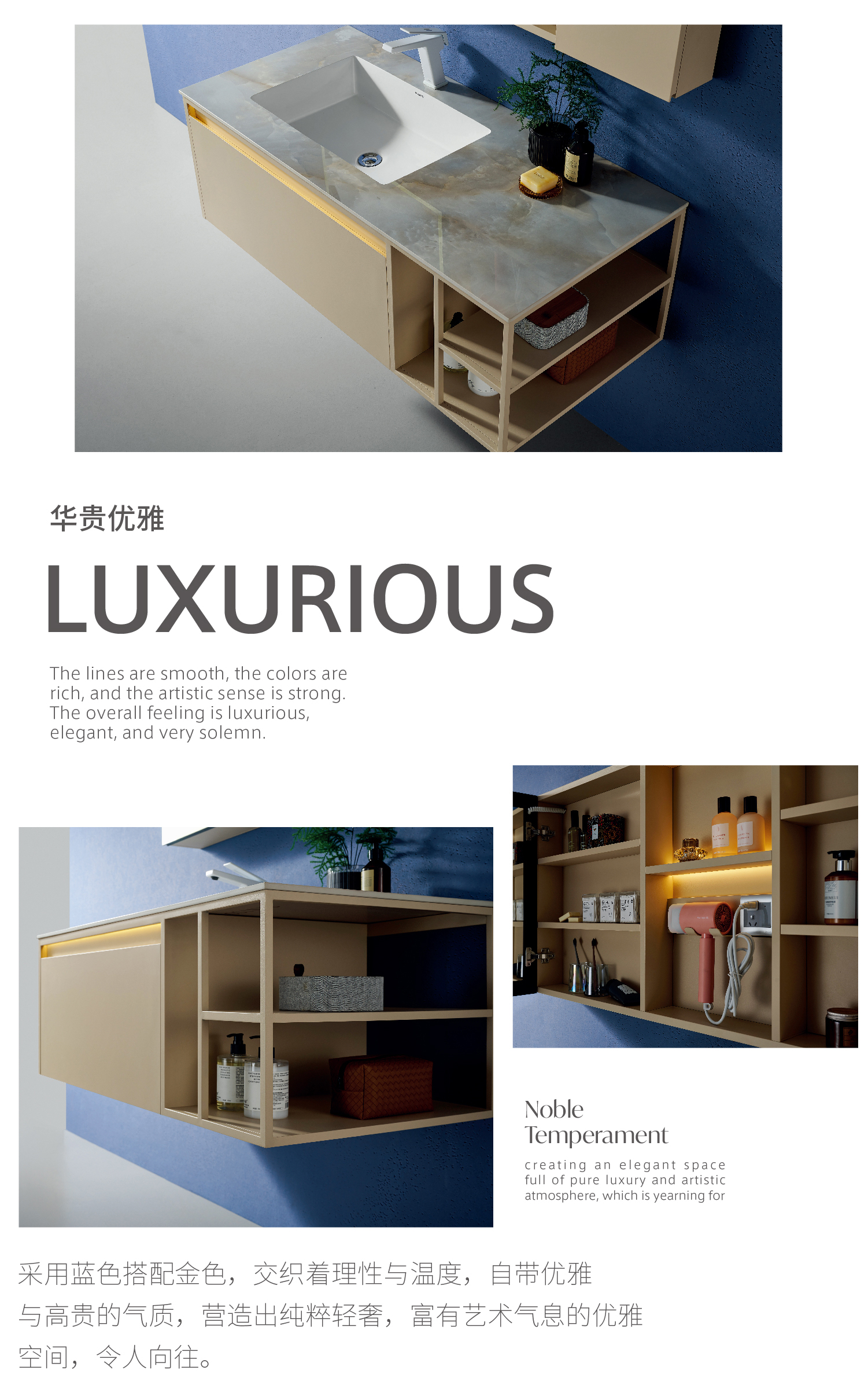 采用藍色搭配金色,交織著理性與溫度,自帶優雅與高貴的氣質,營造出純粹輕奢,富有藝術氣息的優雅空間,令人向往。