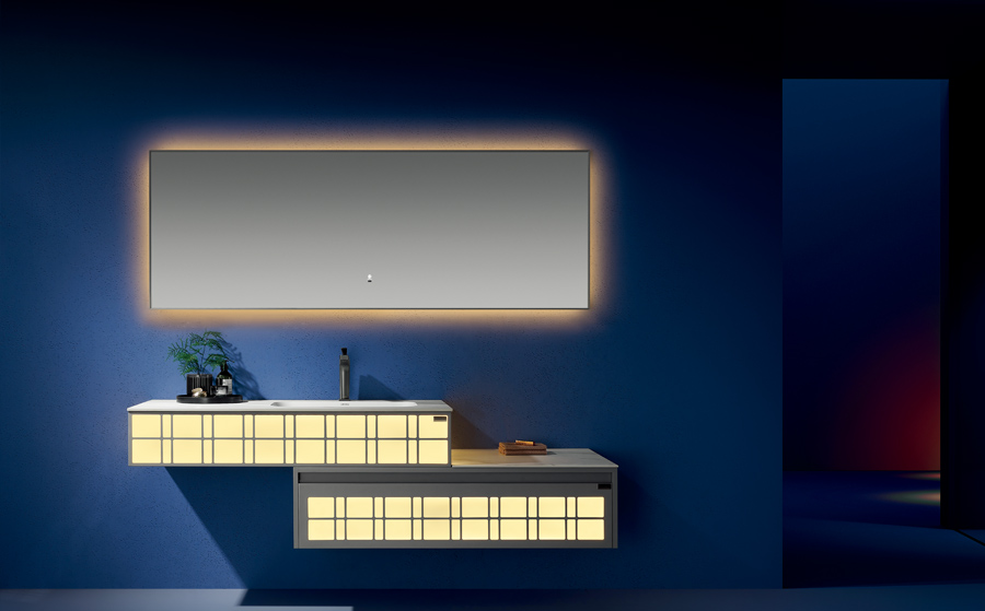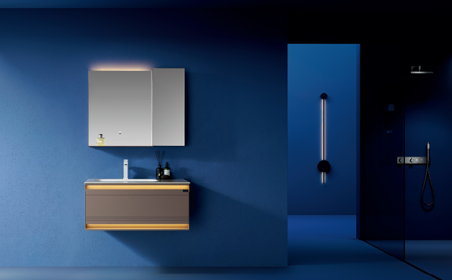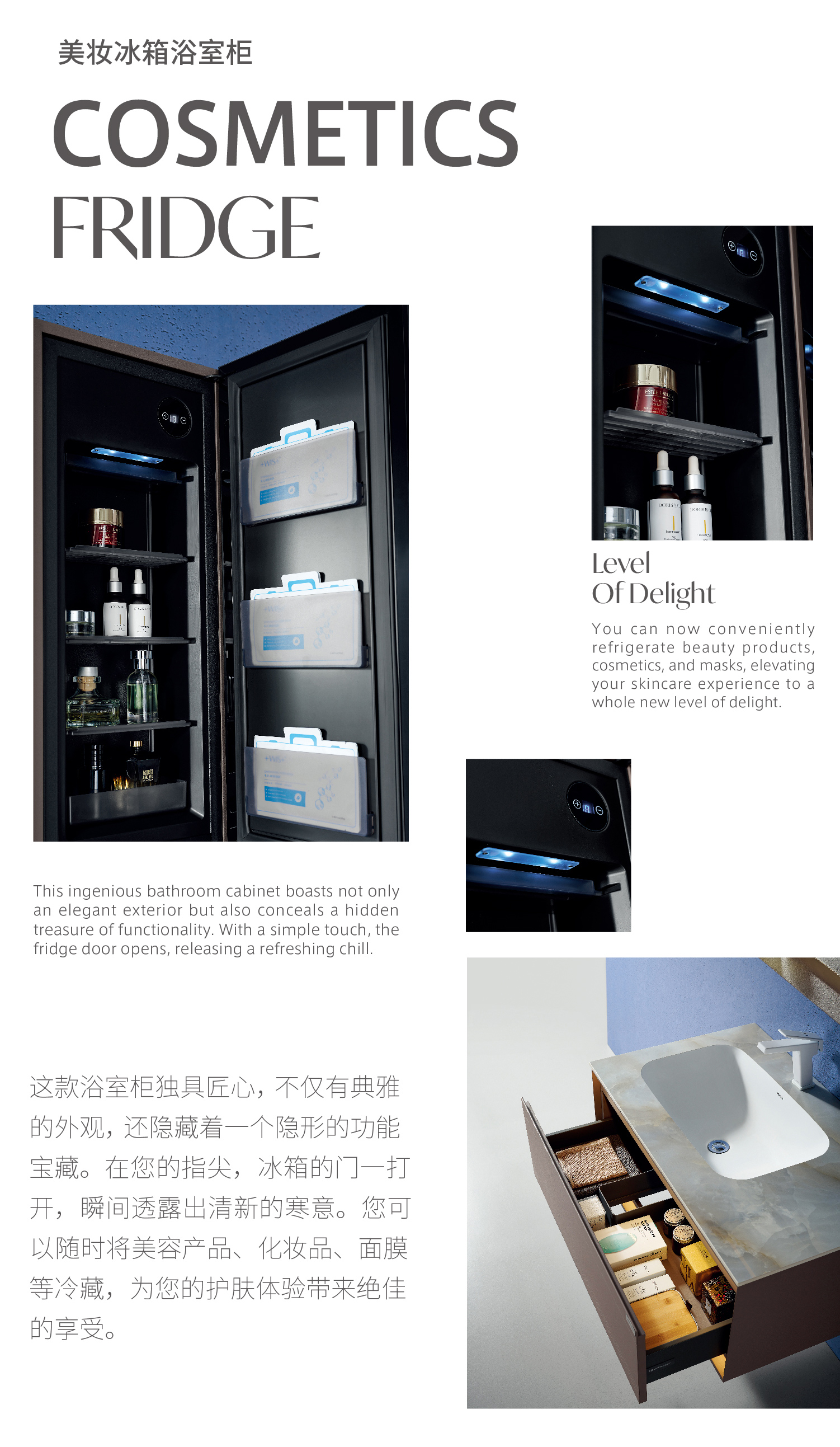 這款浴室柜獨具匠心,不僅有典雅的外觀,還隱藏著一個隱形的功能寶藏。在您的指尖,冰箱的門一打開,瞬間透露出清新的寒意。您可以隨時將美容產品、化妝品、面膜等冷藏,為您的護膚體驗帶來絕佳的享受。