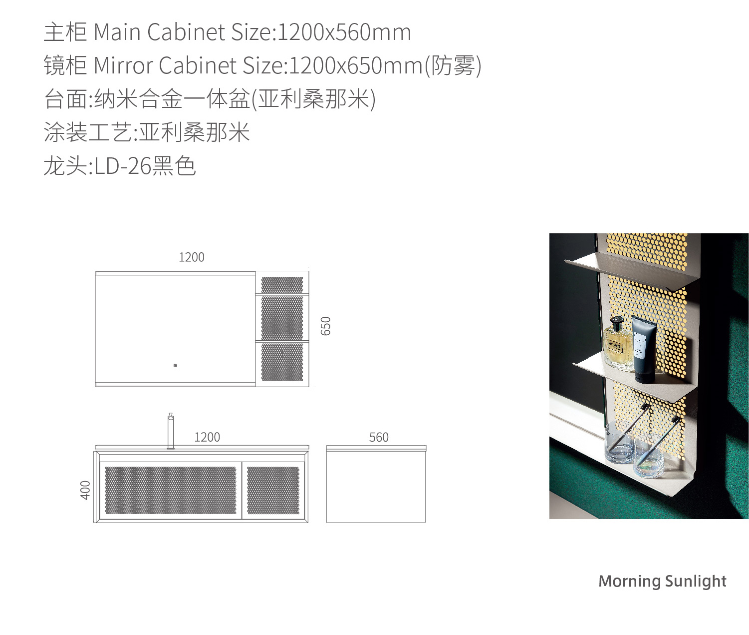 主柜 Main Cabinet Size: 1200x560mm鏡柜 Mirror Cabinet Size: 1200x650mm(防霧)臺面 : 納米合金一體盆(亞利桑那米)涂裝工藝 : 亞利桑那米龍頭 : LD-26 黑色
