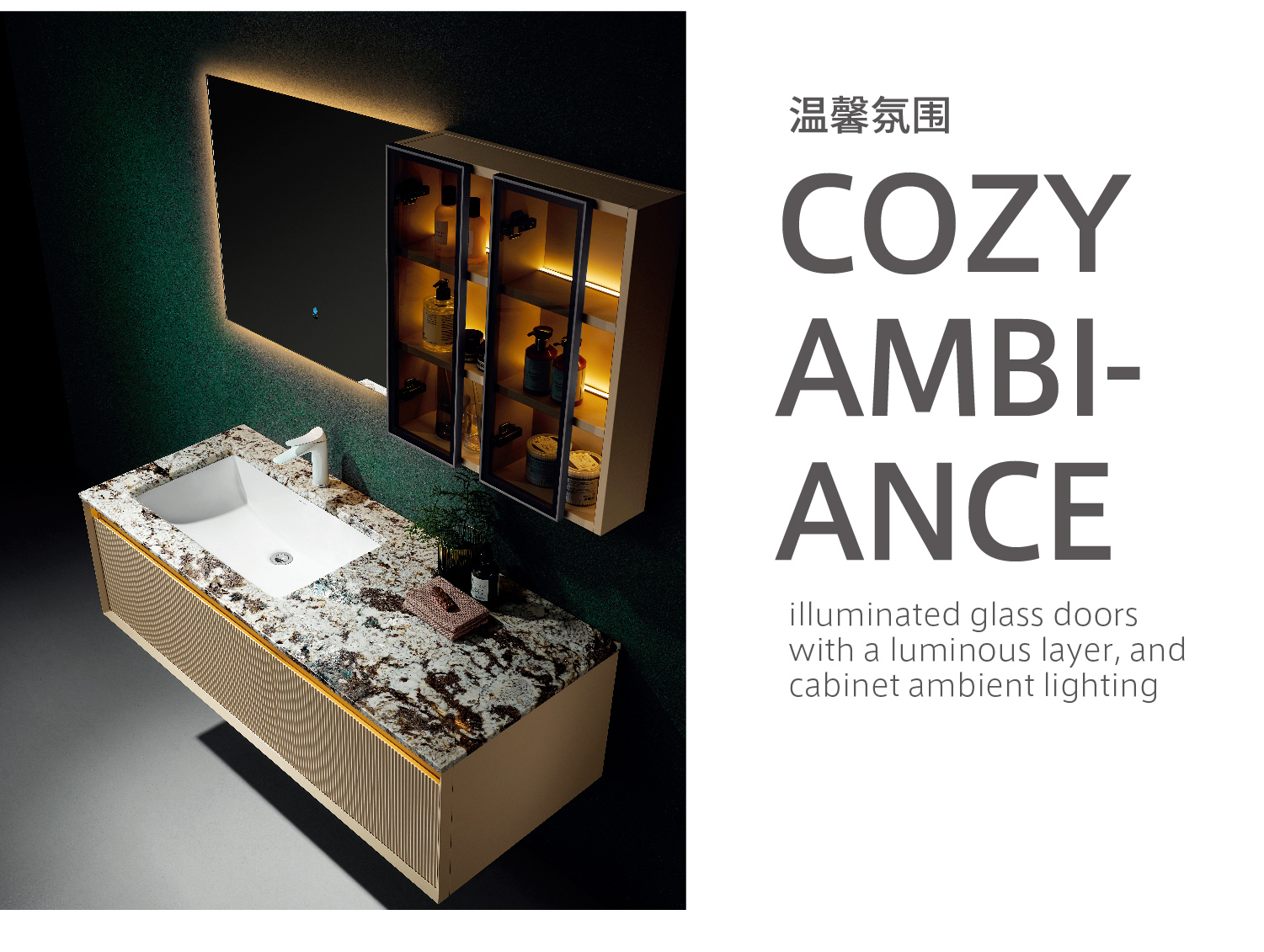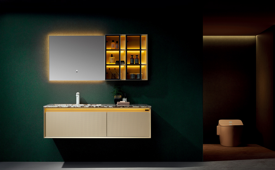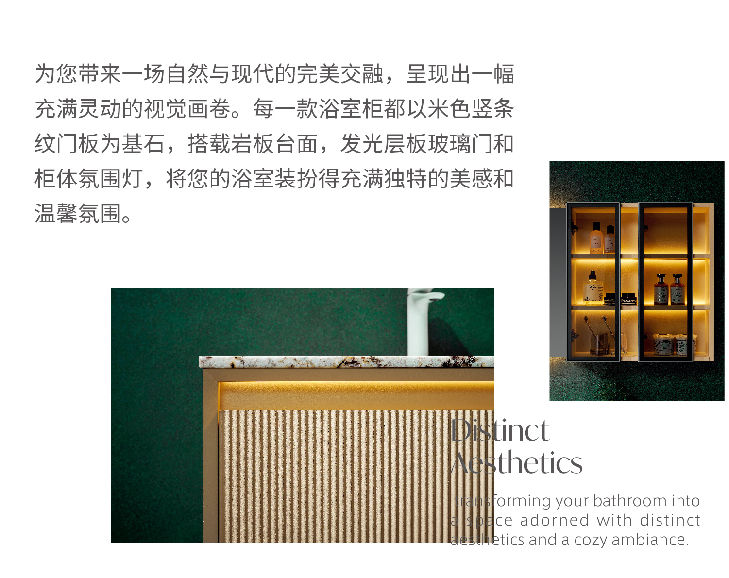為您帶來一場自然與現代的完美交融,呈現出一幅充滿靈動的視覺畫卷。每一款浴室 柜都以米色豎條紋門板為基石,搭載巖板臺面,發光層板玻璃門和柜體氛圍燈,將您 的浴室裝扮得充滿獨特的美感和溫馨氛圍。
