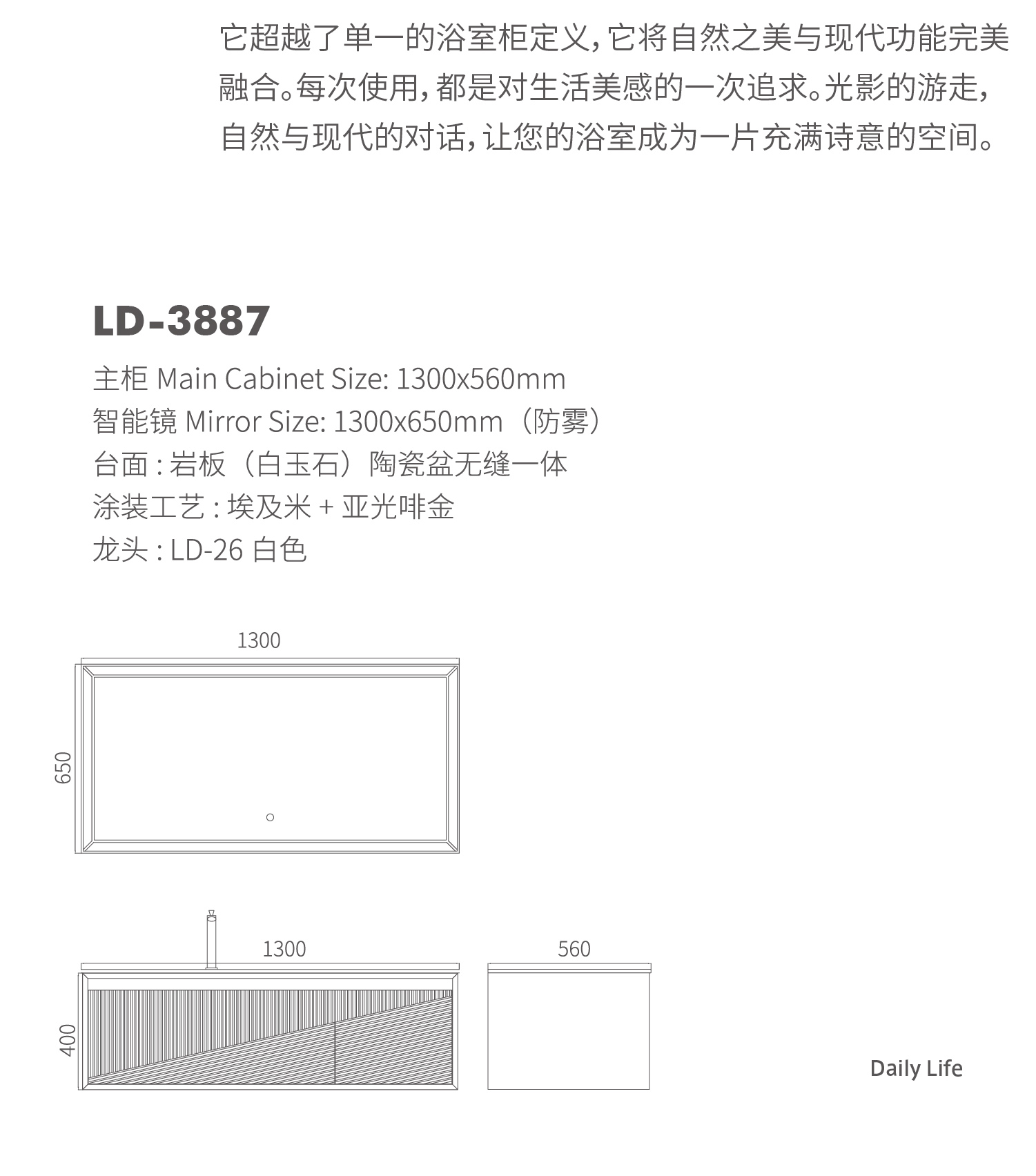 主柜 Main Cabinet Size: 1300x560mm智能鏡 Mirror Size: 1300x650mm(防霧)臺面 : 巖板(白玉石)陶瓷盆無縫一體涂裝工藝 : 埃及米 + 亞光啡金龍頭 : LD-26 白色