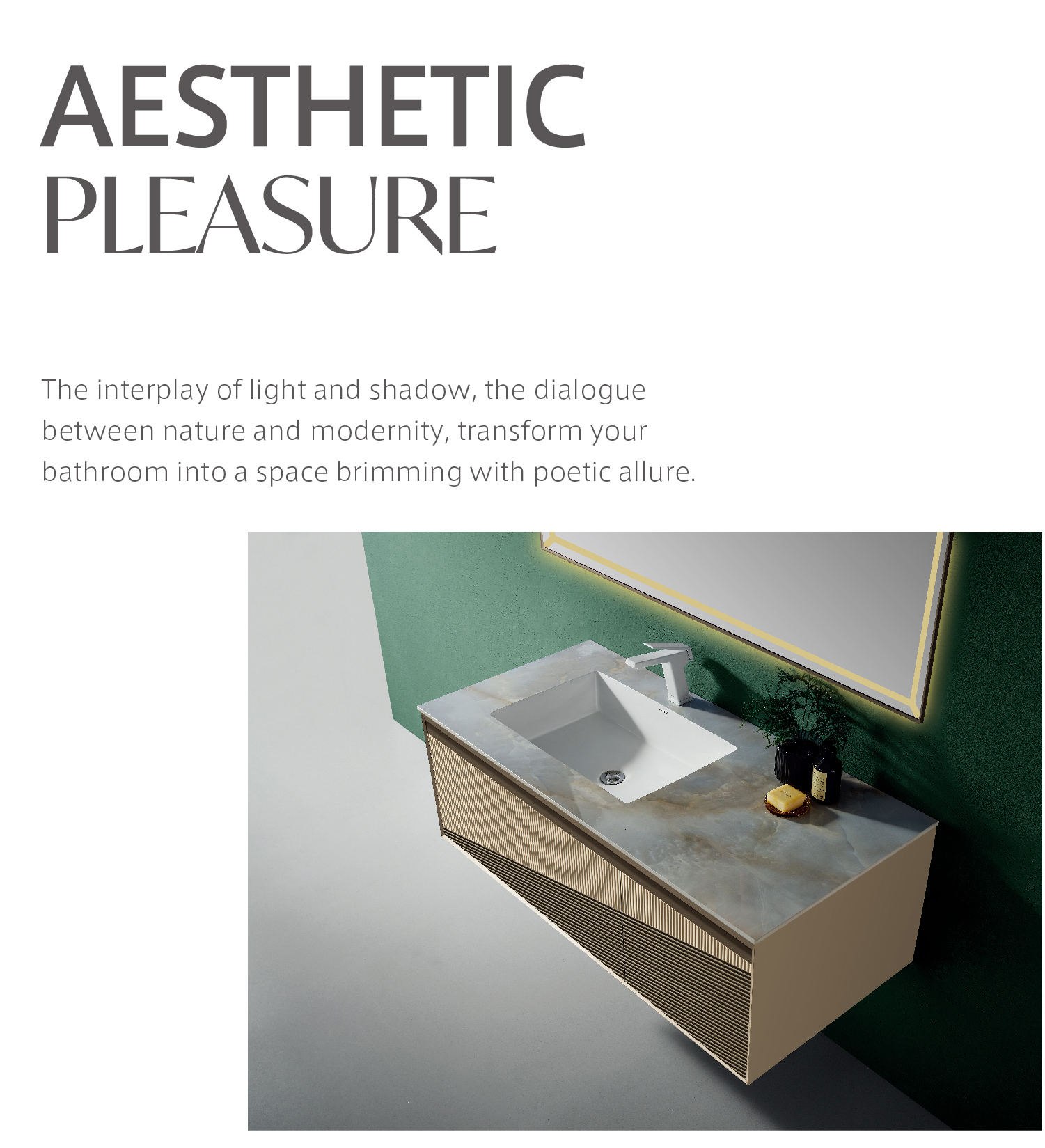 它超越了單一的浴室柜定義,它將自然之美與現代功能完美融合。每次使用,都是對生活美感的一次追求。光影的游走, 自然與現代的對話,讓您的浴室成為一片充滿詩意的空間。