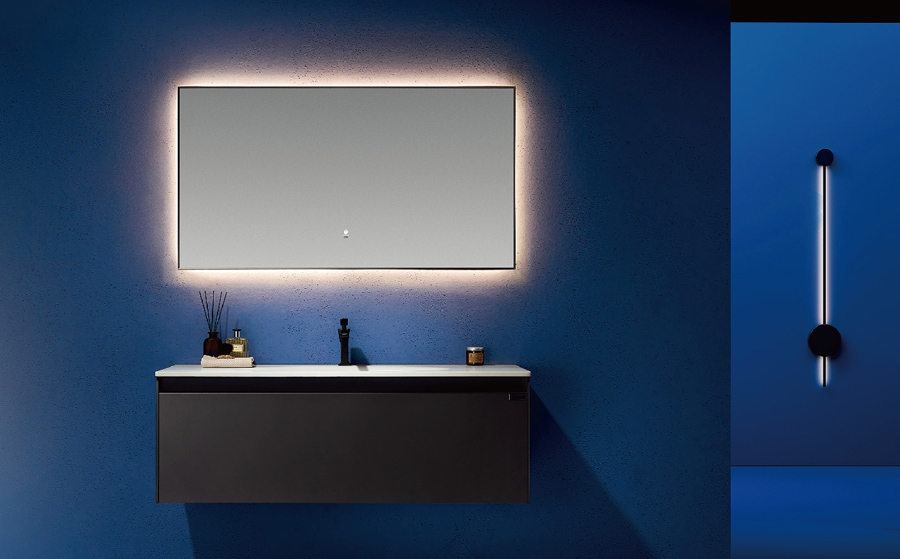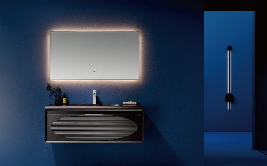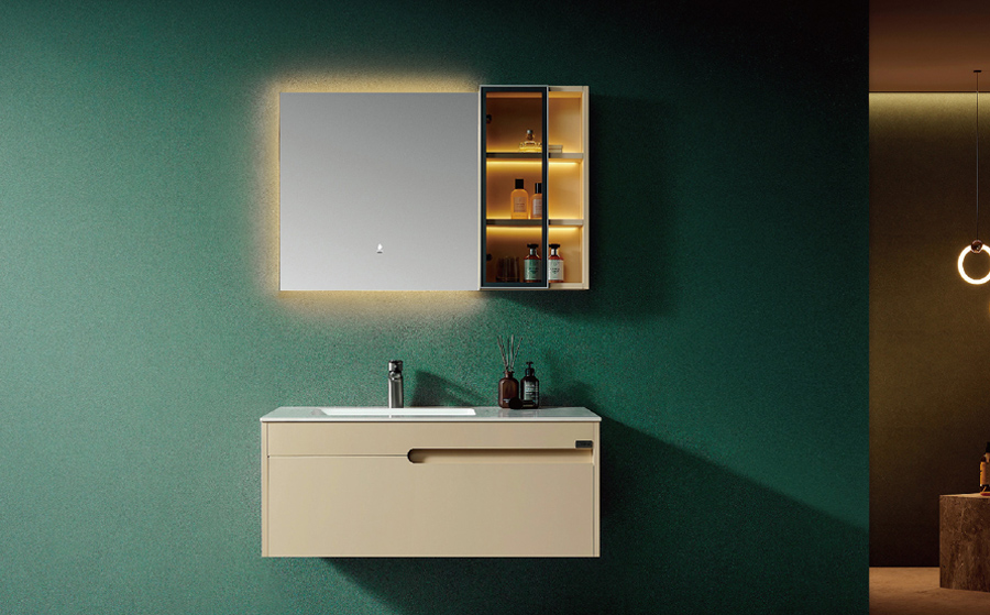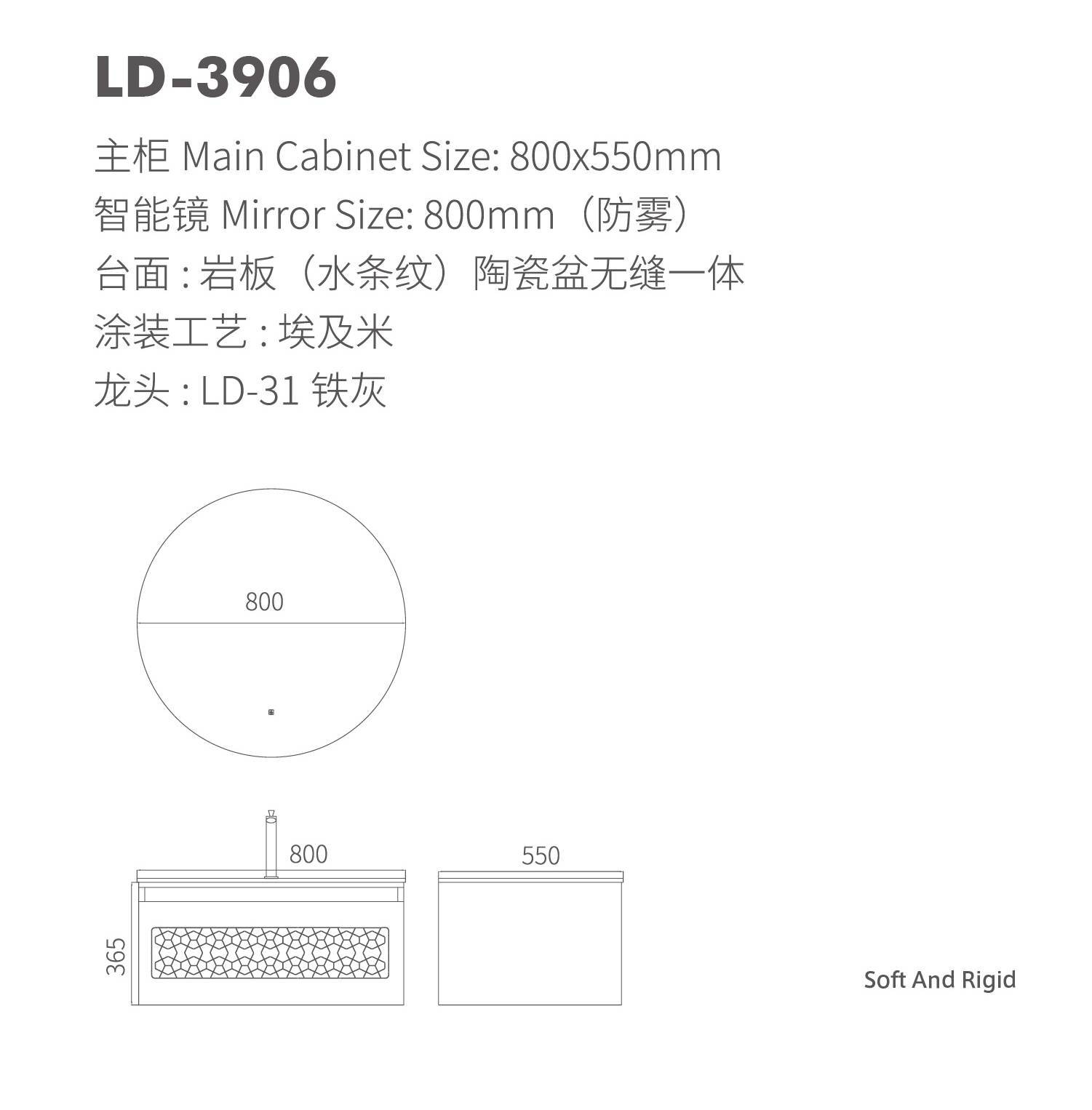 【主 柜】 Main Cabinet Size: 800x550mm【智能鏡】 Mirror Size: 800mm(防霧)【臺 面】 : 巖板(水條紋)陶瓷盆無縫一體【涂裝工藝】 : 埃及米【龍 頭】 : LD-31 鐵灰