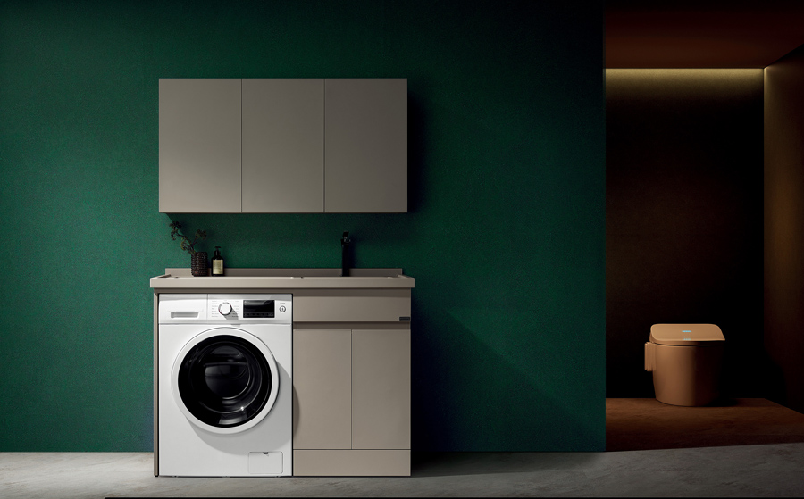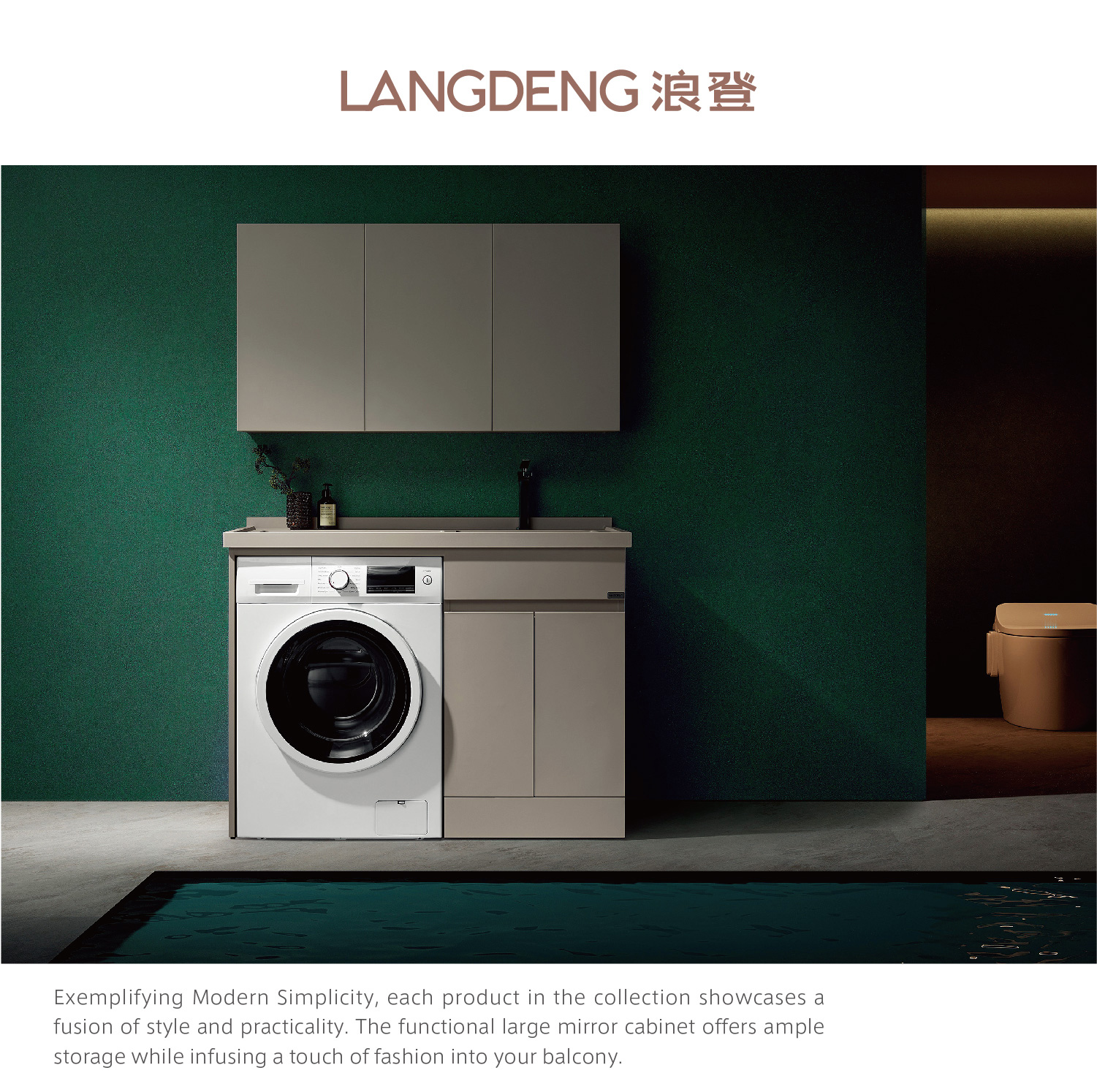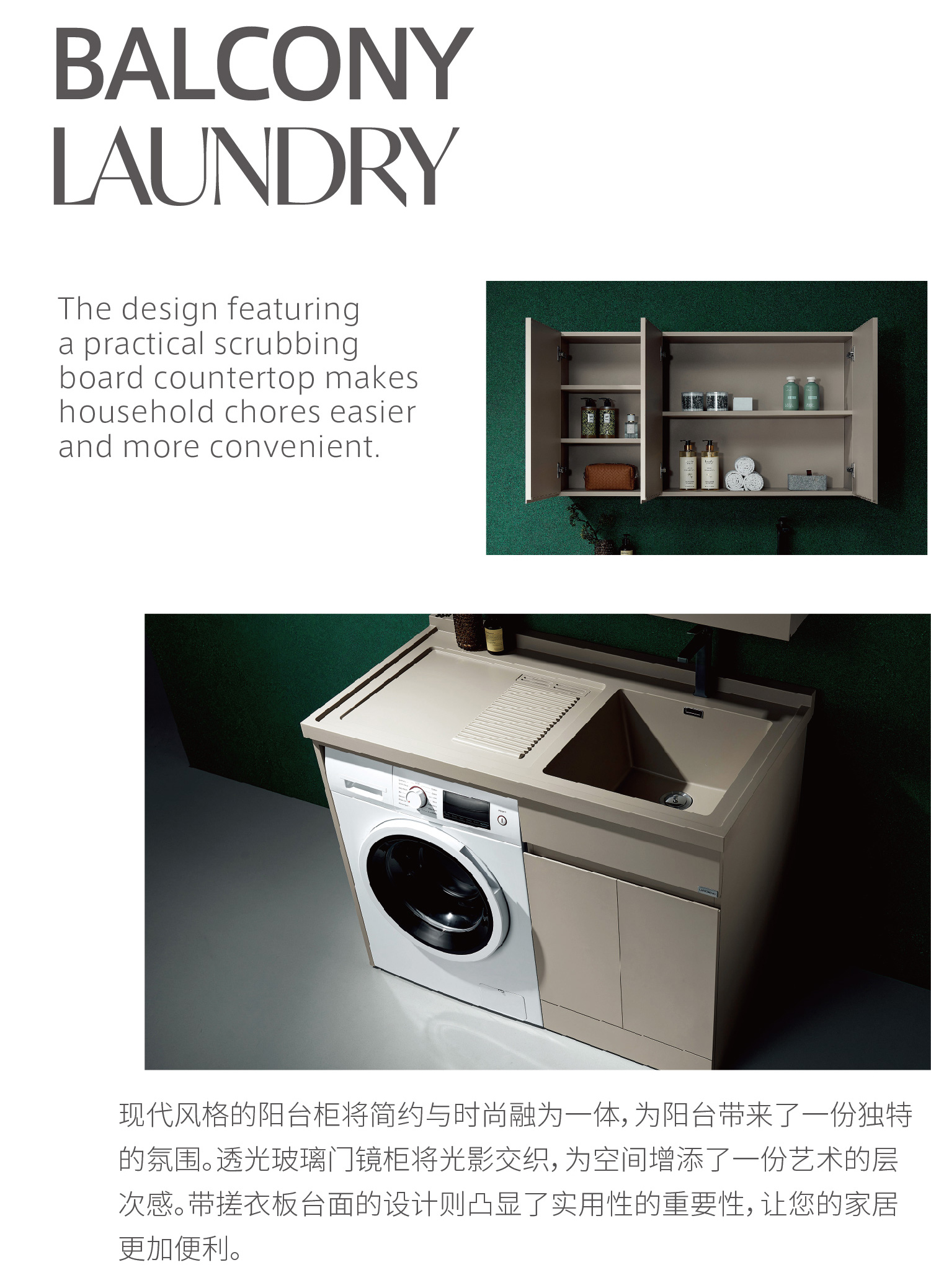 以現代簡約為特色,每一款產品都彰顯出時尚與實用的智慧。實用型大鏡柜既為您提供了寬敞的儲物空間,又為陽臺注 入了時尚的氣息。帶搓衣板功能臺面的設計則使家務更加輕松便捷。