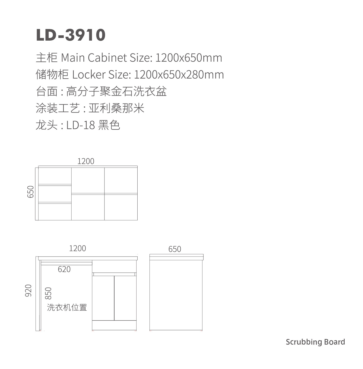 【主 柜】 Main Cabinet Size: 1200x650mm【儲物柜】 Locker Size: 1200x650x280mm【臺 面】 : 高分子聚金石洗衣盆【涂裝工藝】 : 亞利桑那米【龍 頭】 : LD-18 黑色